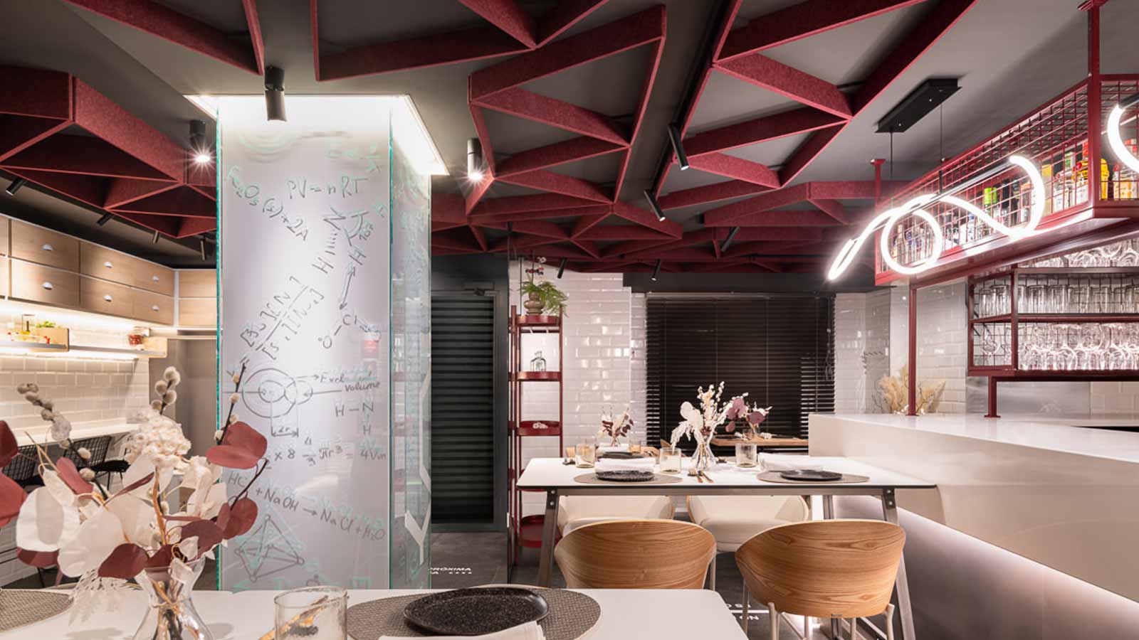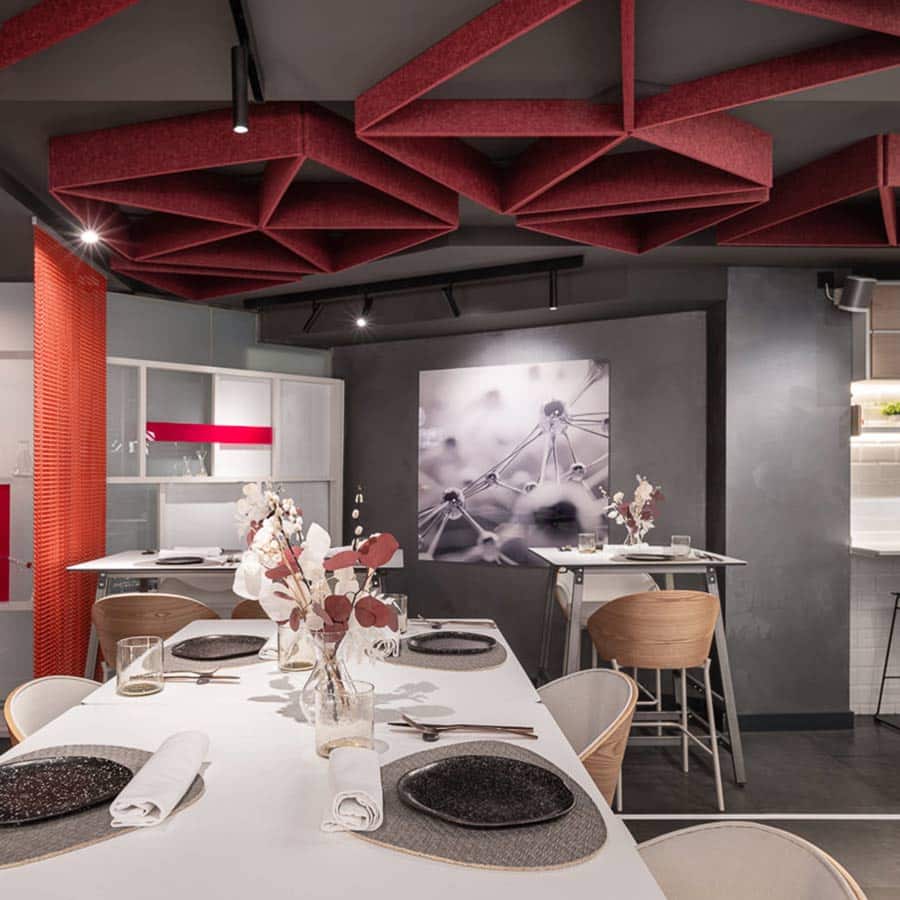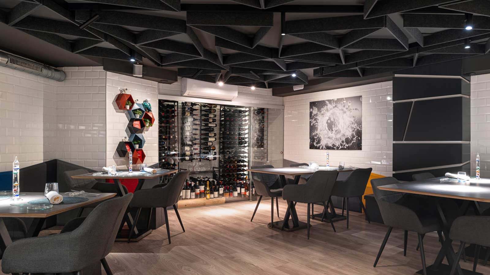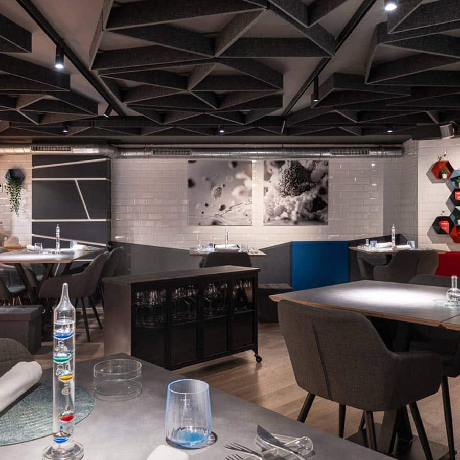 En colaboración con Comodoos Interiores, desarrollamos una solución acústica única, fabricada en PET reciclado, que responde tanto a criterios funcionales como estéticos. El diseño se integra de manera natural en el espacio, convirtiéndose en un elemento más del lenguaje interior del local.