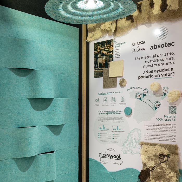 Los visitantes de estos días, entre los que se incluye Su Majestad La Reina, han podido ver en primicia algunos de nuestros diseños termoformados fabricados con lana 100% española, que serán la base de nuestra nueva gama de soluciones acústicas naturales. Las texturas y colores se complementan con el espacio para dejar paso a la experimentación con la lana en sus diferentes estados. Además, hemos expuesto parte de nuestra nueva colección de luminarias fonoabsorbentes.