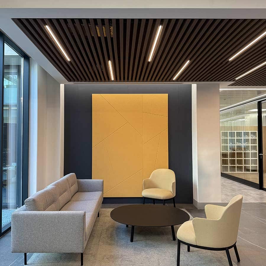 En la nueva sede de la ONCE en Valladolid, nuestros paneles acústicos en PET han sido clave para crear un entorno funcional y estéticamente equilibrado, ya que no solo reducen el ruido y la reverberación, sino que también aportan carácter y personalidad al espacio gracias a sus infinitas posibilidades de personalización.