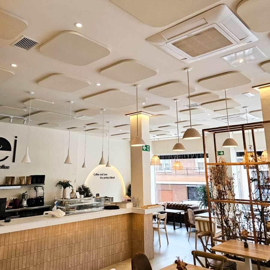 En Sei Specialty Coffee saben que disfrutar de un buen café también depende del confort del espacio. Por eso, hemos llevado a cabo el acondicionamiento acústico del local, instalando paneles acústicos que controlan el sonido reduciendo el ruido ambiente y la reverberación.